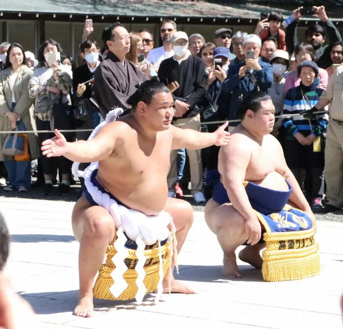 同神社創立150年の節目だった19年に同じモンゴル出身の白鵬と鶴竜が行って以来6年ぶり。第74代横綱は「俺でいいのかな。歴代の横綱たちがやったことを自分もやっているので、うれしい」と笑みをこぼした。新横綱の春場所は右肘痛などで途中休場。夏場所(5月11日初日、東京・両国国技館)に向け「だいぶ良いけどちゃんと治ったわけじゃない。今のところは問題ない」と強調した。