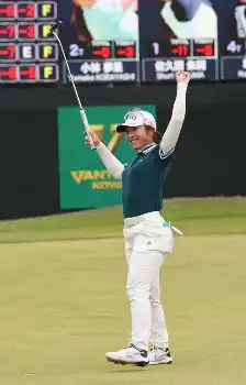 短いウイニングパットを沈めた佐久間は両手を突き上げた。「やっと勝てた」。これまで2位が4回。一緒に悔しい思いを味わってきた後藤勝キャディーと抱き合うと涙が頬を伝った。