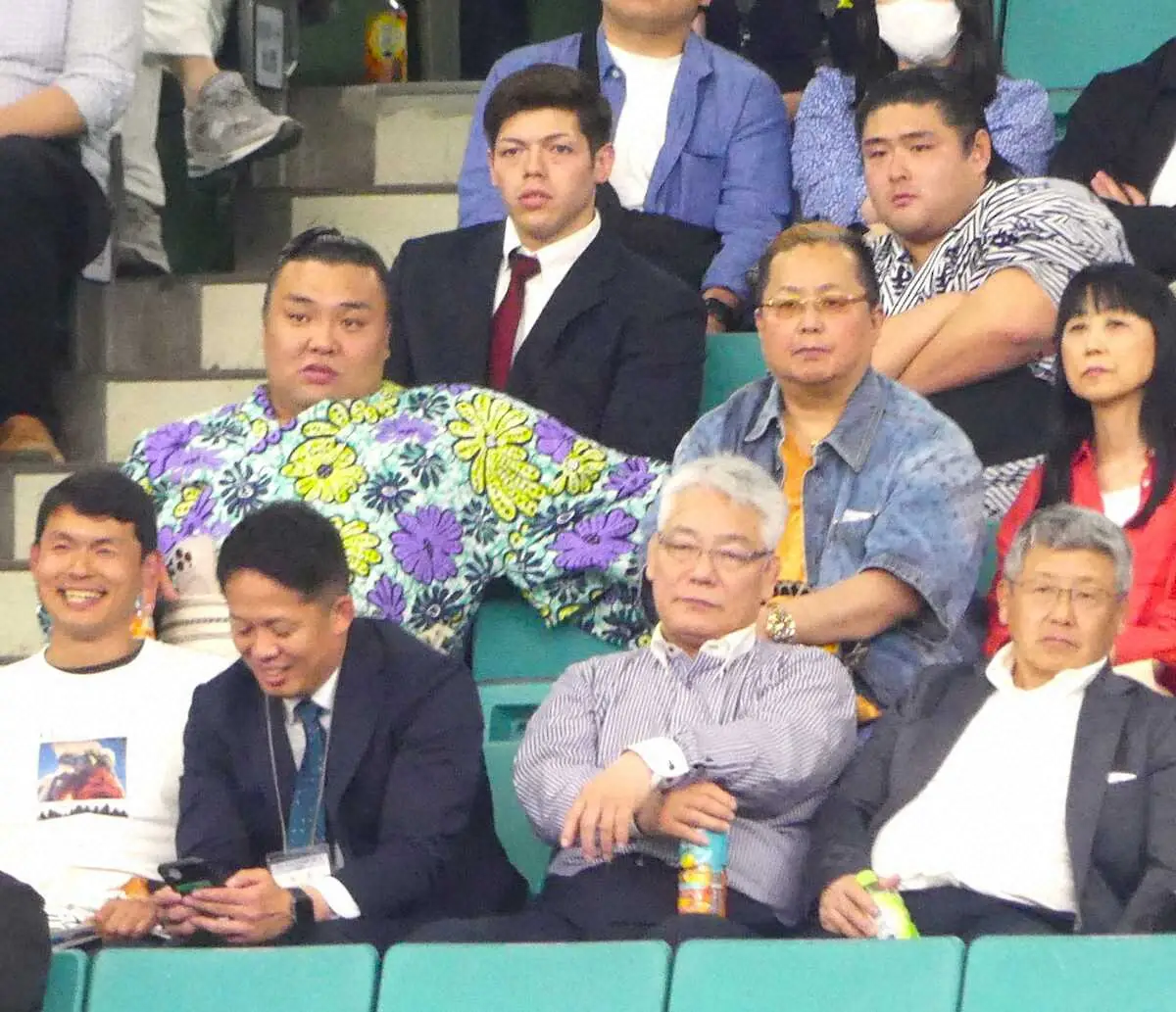 試合を観戦する音羽山部屋の霧島(中列左)と今田(後列右)。後列左は村尾三四郎