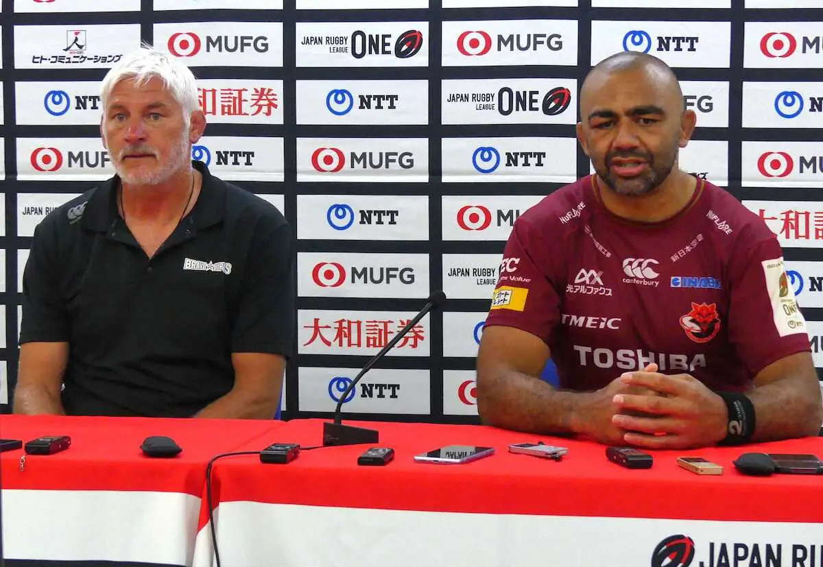 <BL東京・横浜>レギュラーシーズン首位突破を決め、会見に臨むBL東京のリーチ・マイケル主将(右)とトッド・ブラックアダー・ヘッドコーチ