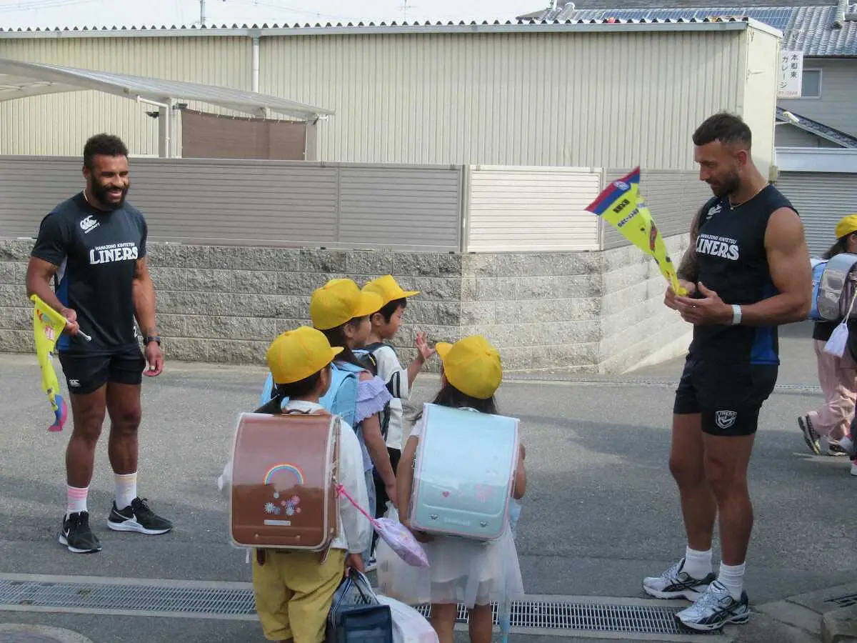 全選手、全スタッフが参加し、黄色い旗を持って子どもたちの安全を守った。今季限りでの退団が発表された元オーストラリア代表ハーフ団のSHウィル・ゲニア(37)とSOクウェイド・クーパー(37)も、午前8時頃から正門近くに立ち「オハヨウゴザイマス」と登校してくる小学生に笑顔で声を掛けた。