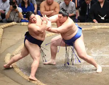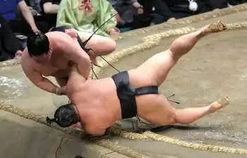<夏場所8日目>大の里(右)は平戸海をおし出しで破る (撮影・西川祐介)