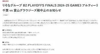 B2プレーオフ決勝が会場停電で中止 A千葉―富山戦、復旧の見込み立たず異例の当日発表