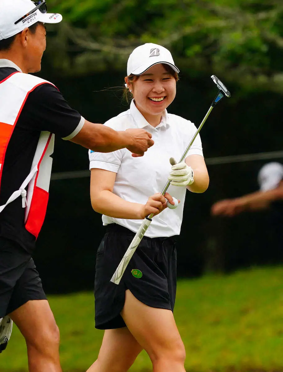 この日は同じく初日から首位を守っている佐久間朱莉(22=大東建託)とスコアの競り合いだった。3番パー4で約3メートルのバーディーパットを沈めて単独首位。その後佐久間に1打リードを許すも、9番でバーディーを奪い、首位に並んで折り返した。