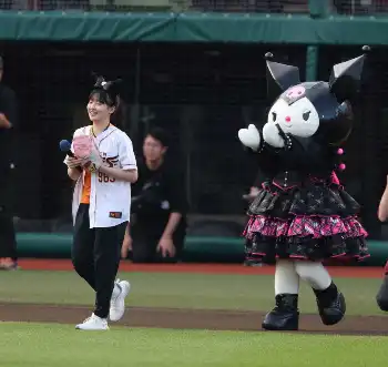 サンリオの推しキャラでもあるクロミとともに「猫耳」のカチューシャ姿で登場。クロミからも後押しを受け、投げた渾身の一球は惜しくもワンバウンド。