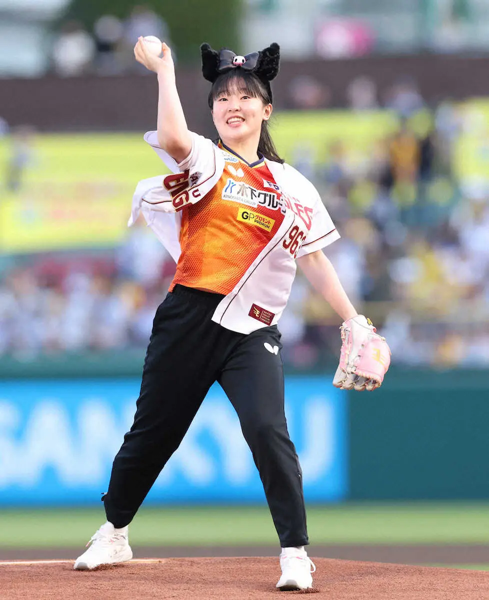 楽天-阪神戦(楽天モバイル)のセレモニアルピッチに地元・宮城県仙台市出身で卓球選手の張本美和(16)が登場した。