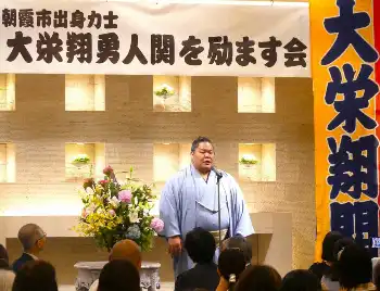 乾杯する(左から)二所ノ関親方、大の里、馬主の深澤朝房氏