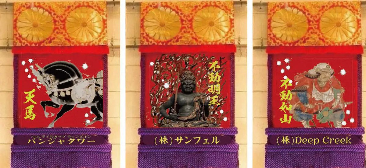 華やかな雰囲気のなかで行われた祝賀会に花を添える、サプライズ発表だった。パンジャタワーの馬主で大の里東京後援会の深澤朝房氏が、大の里に三つぞろいの化粧まわしを贈ると発表。その図案が出席者200人超の前で初披露された。深澤氏によると9月の秋場所、10月のロンドン公演でお披露目を予定しているという。3本とも深澤氏の出身地、山梨県に由来するもので、横綱が締める化粧まわしは甲州市の恵林寺に所蔵されている「不動明王」がデザインされた。横綱として「不動心」を貫いてほしいという思いが込められている。