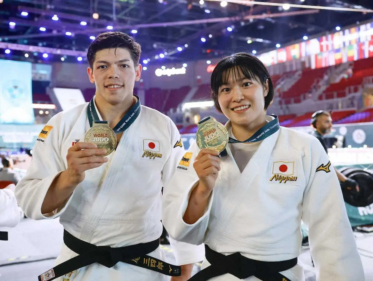 柔道の世界選手権男子90キロ級決勝で金メダルを獲得した村尾三四郎(左)と女子70キロ級で金メダルを獲得した田中志歩=17日、ブダペスト(共同)