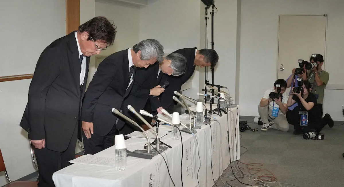 <国士舘大男子柔道部員大麻使用会見>会見で頭を下げる(左から)国士舘スポーツプロモーションセンター・美納淳一サブチーフ・スポーツ・ディレクター、国士舘大・熊迫真一副学長・学長室長、国士舘大・田原淳子学長、国士舘大・武井幸二学生部長(撮影・郡司 修)