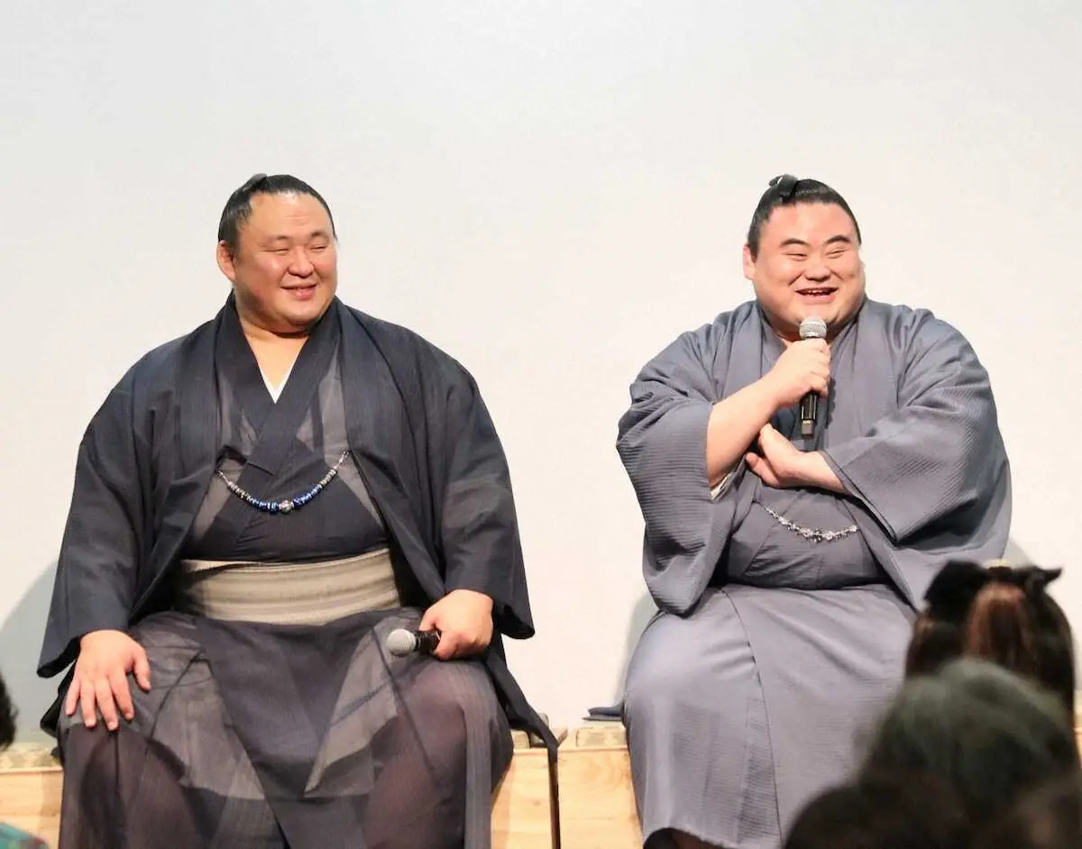 幕内・玉鷲(40=片男波部屋)と、トークショーや握手会でファンと交流した。「玉鷲関がいてくれて、助かっている。一人じゃ、この場はもたない(笑い)」。自身の顔はめパネルに納まって笑顔を見せるなど、楽しんでいる様子だった。