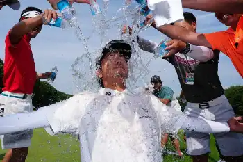 <プレーヤーズチャンピオンシップ・サトウ食品・最終日>優勝しウォーターシャワーの祝福を受ける生源寺龍憲(撮影・西尾 大助)