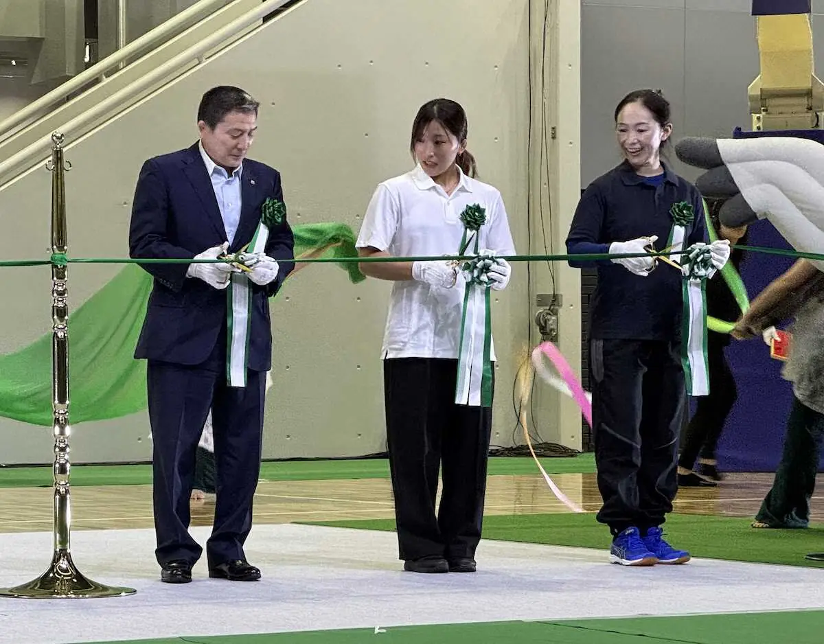 駒沢体育館リニューアルオープンイベントでテープカットをする須崎優衣(中央)。左は日本レスリング協会の富山英明会長、右はゴールボールの浦田理恵