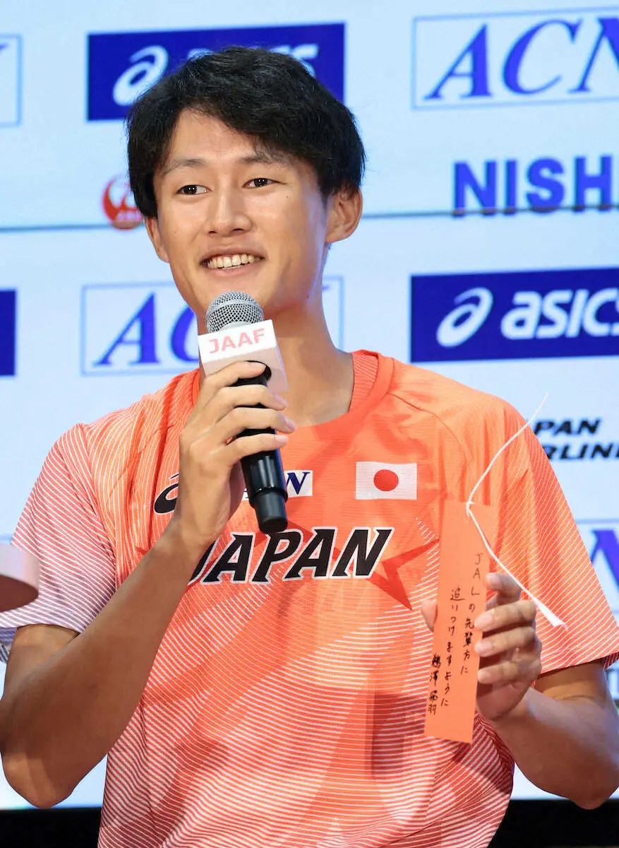 男子200メートル2大会連続出場の鵜沢飛翔(22、JAL)は「JALの先輩方に追いつけますように」と決意を込めた。同じ所属先の北口、村竹の活躍に刺激を受け「一番身近で偉大な先輩2人に追いつきたい」と語った。男子400メートル障害で初出場の井之上は「世界陸上のスタートラインに笑顔で立てますように」と意気込みを記した。