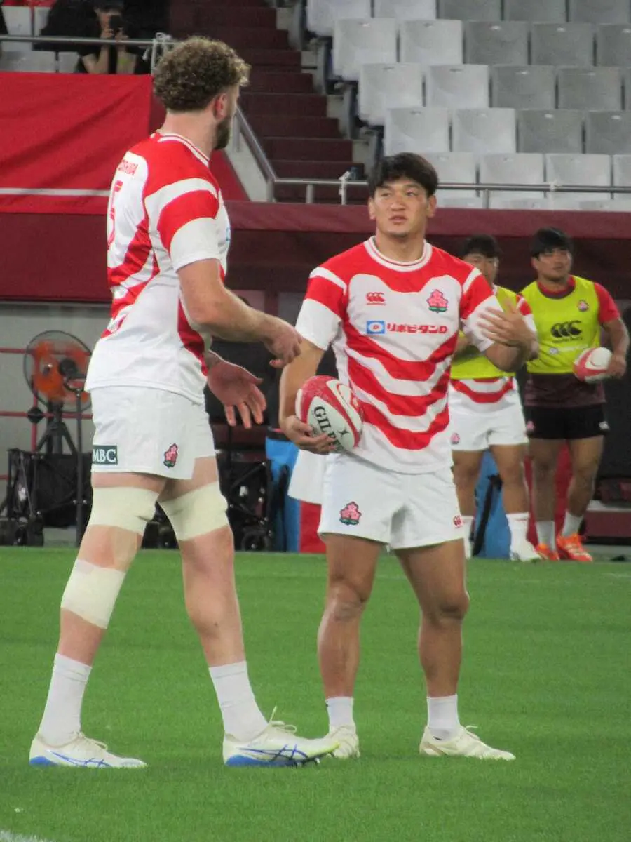 フランス1部リーグを制して1日から合流したSH斎藤とハーフ団を組む。合宿中は同じ部屋で過ごすことが多く「フランスのスタイルやキックの考え方を聞いて良い準備ができた」と連係を深めてきた。超速ラグビーをけん引する司令塔は「2人で良いゲームをつくれたら」と意気込んだ。 (前川 晋作)