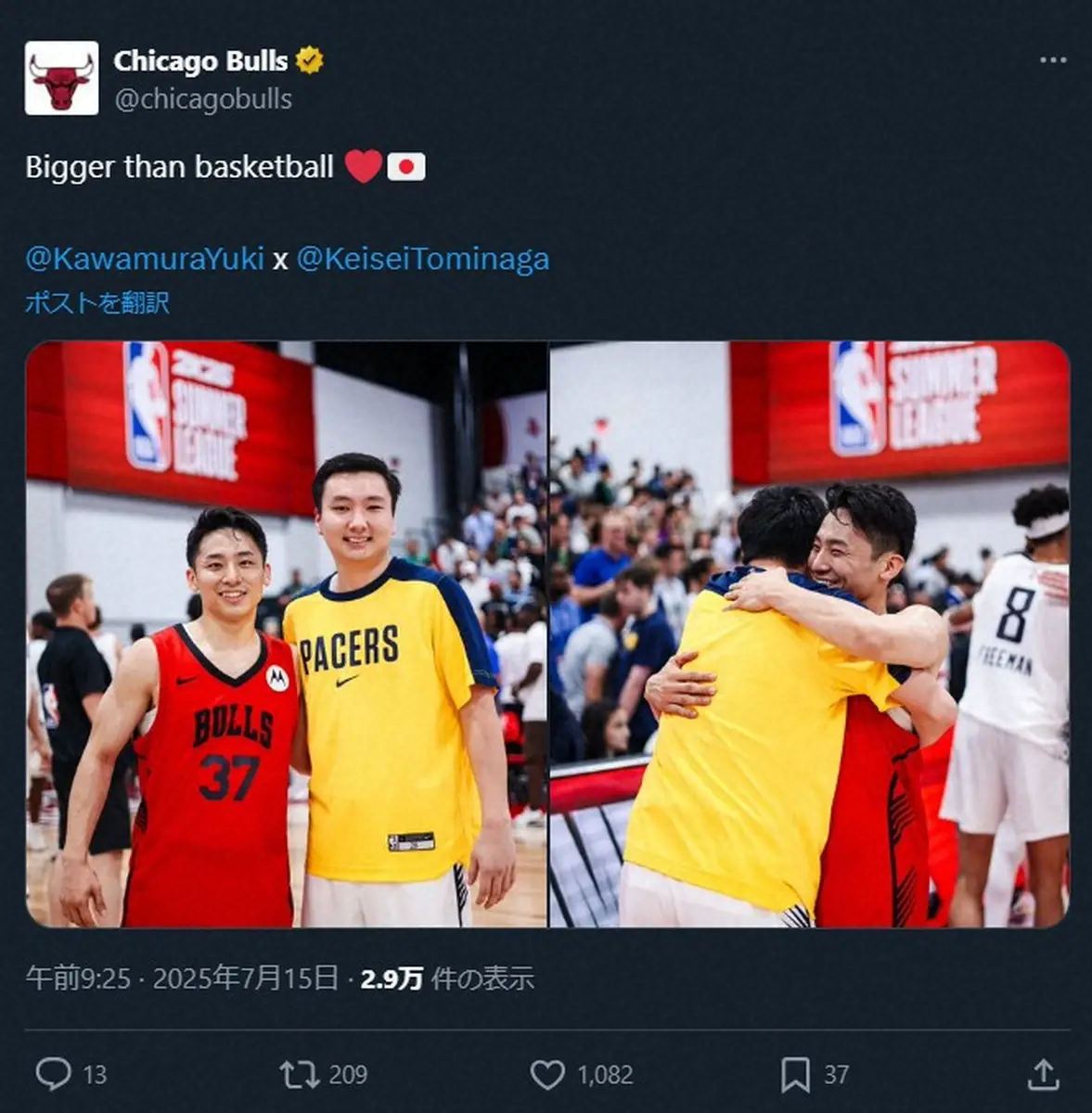 試合後にブルズの公式Xは河村と富永をタグ付けして「Bigger than basketball」と記して、ハートマークと日本国旗の絵文字とともに2ショットを投稿した。