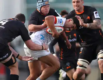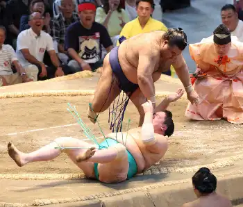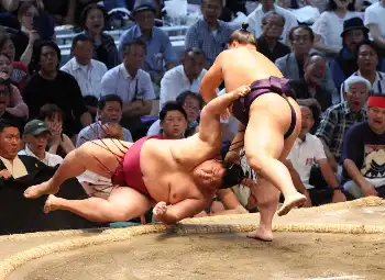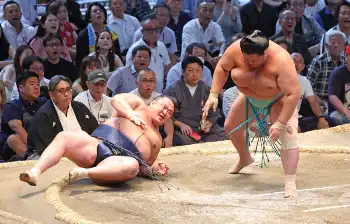 <名古屋場所・11日目>霧島(左)を上手捻りで下す大の里(撮影・亀井 直樹)