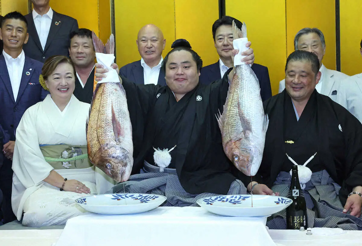 <名古屋場所・千秋楽> 優勝し、鯛を持ち上げる琴勝峰(中央)。右は佐渡ケ嶽親方、左はおかみの真千子さん (撮影・亀井 直樹)