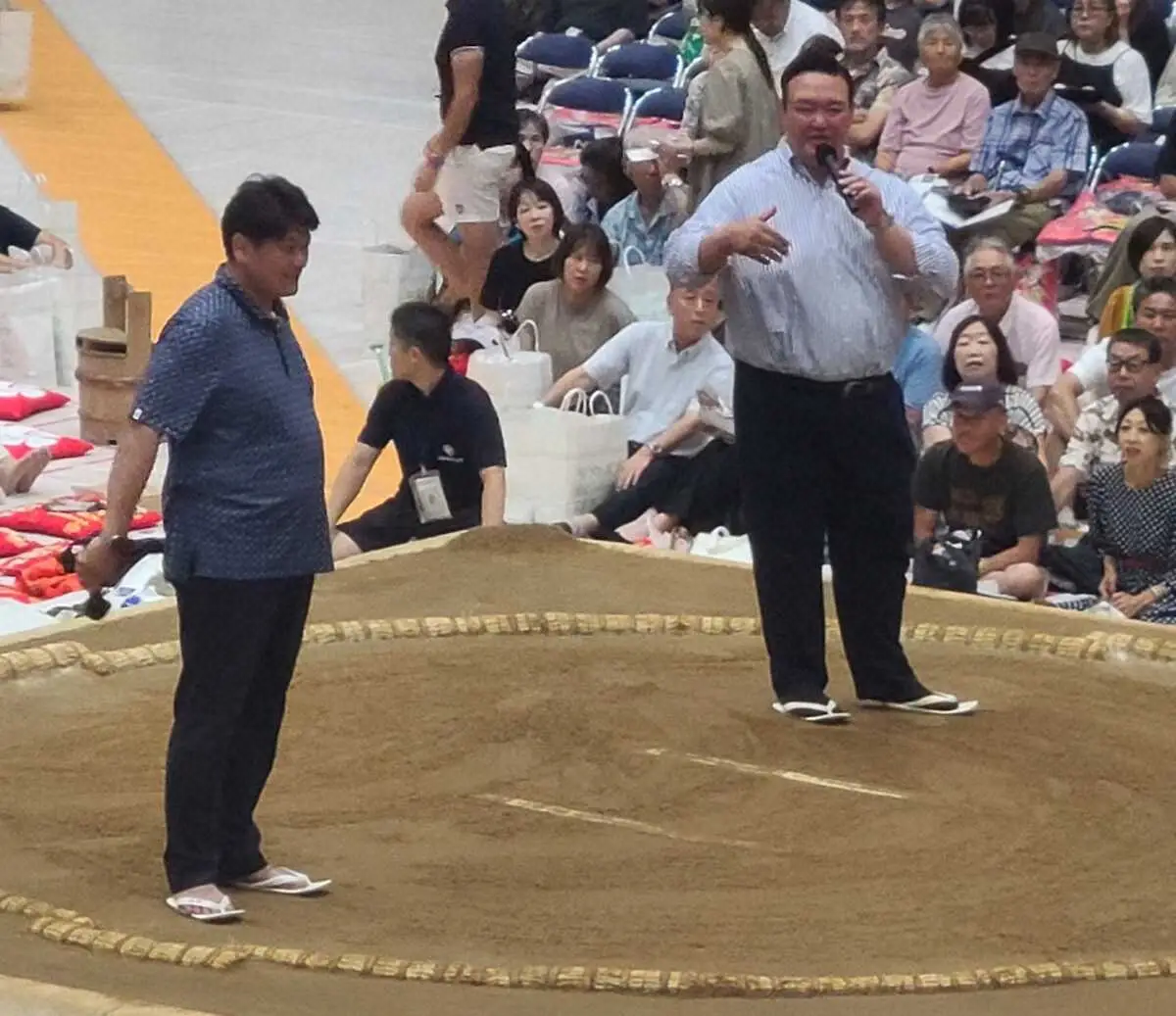 朝稽古終了後に現役力士が土俵上でトークイベントを行うのは定番となっているが、部屋の師匠が登場するのは極めて異例。立浪親方は同巡業の担当(先発親方)だが、この日は茨城県出身の二所ノ関親方が特別に来場したためスペシャル企画が実現となった。2人は豊昇龍、大の里と東西の横綱の師匠。司会者から「2人には共通点があります。ともに横綱を育てられました」と紹介されると大きな拍手が沸き起こった。