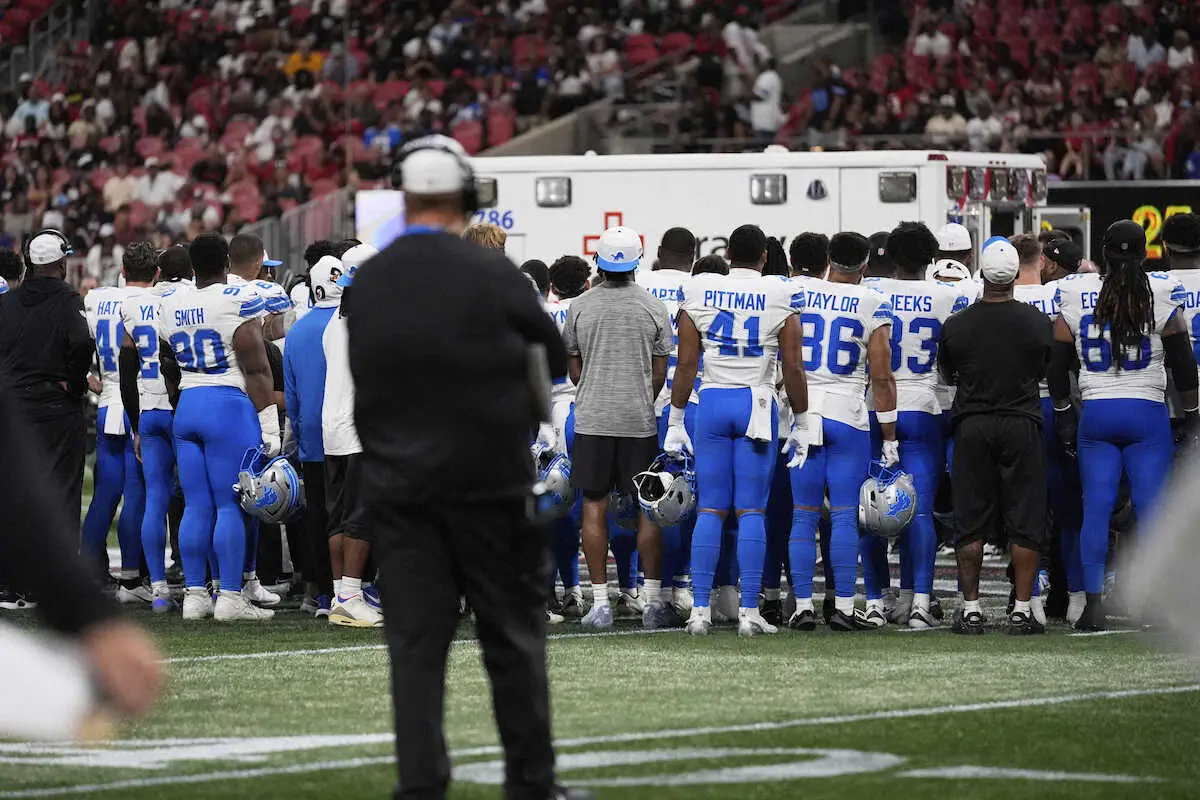 手を取り合ってノリスの無事を祈るライオンズ(白と青)とファルコンズ(黒)の選手たち(AP) Photo by AP 【NFL】選手救急搬送で試合打ち切り…両チームが合意「誰一人としてプレー… ギャラリーで見る この記事のフォト 2025年08月09日の画像一覧 もっと見る 2025年08月09日の画像をもっと見る