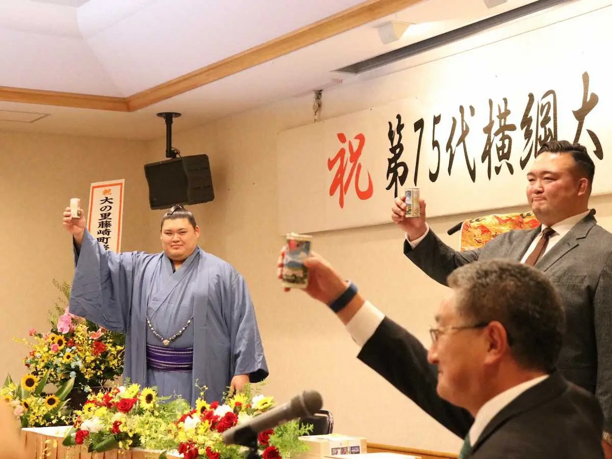 大相撲夏場所後に第75代横綱に昇進した大の里(25=二所ノ関部屋)の昇進祝賀会が19日、青森県藤崎町内で開かれた。しこ名の由来になり「相撲の神様」とも呼ばれた元大関・大ノ里(本名・天内=あまない=萬助)の故郷で師匠の二所ノ関親方(元横綱・稀勢の里)ら約150人が出席した。