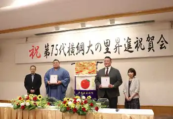 大の里からは藤崎町の発展と子供たちの健やかな成長を願い、化粧まわしの返還があった。新大関だった昨年11月に藤崎町から贈呈されたもので「化粧まわしを頂いて頑張ることができた」と話す。横綱昇進に伴った返還で今後は藤崎町役場内に展示される。