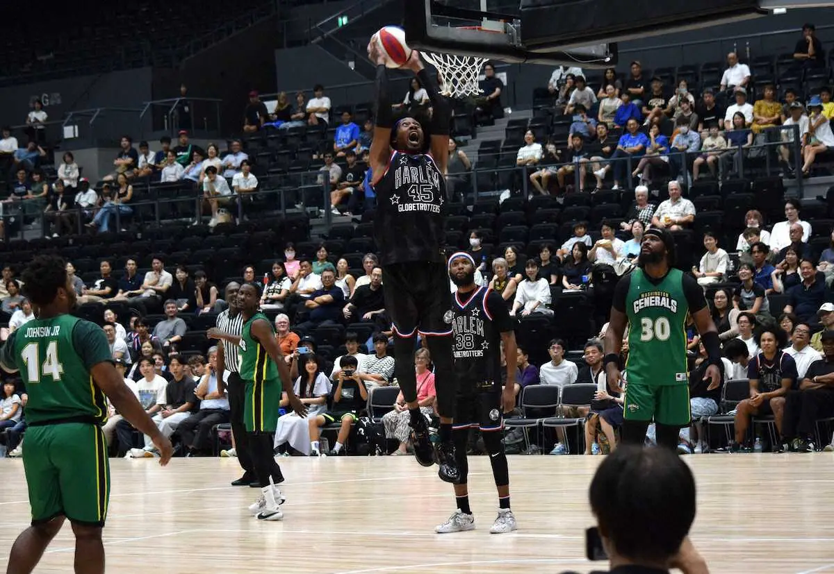 メンバーはNCAAやNBAで通用するスキルを持ちながら“魅せるバスケット”に特化した集団。これまでの観客動員は1億人以上で、世界124カ国以上で愛され続けている。ワシントン・ジェネラルズ相手の試合が始まると、華麗なパス回しからのダンクシュートや、特別に設けられた9メートルの4ポイントラインからのシュート、数々のトリックショットを決めた。