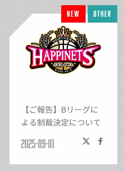 B1秋田は1日に公式サイトを更新。ユースチームのスタッフがユース所属選手に対して不適切な発言を繰り返し行ったことを報告。Bリーグから当該スタッフのけん責およびバスケットボール関連活動の全部の停止・禁止1カ月などの制裁を受けたことを発表した。