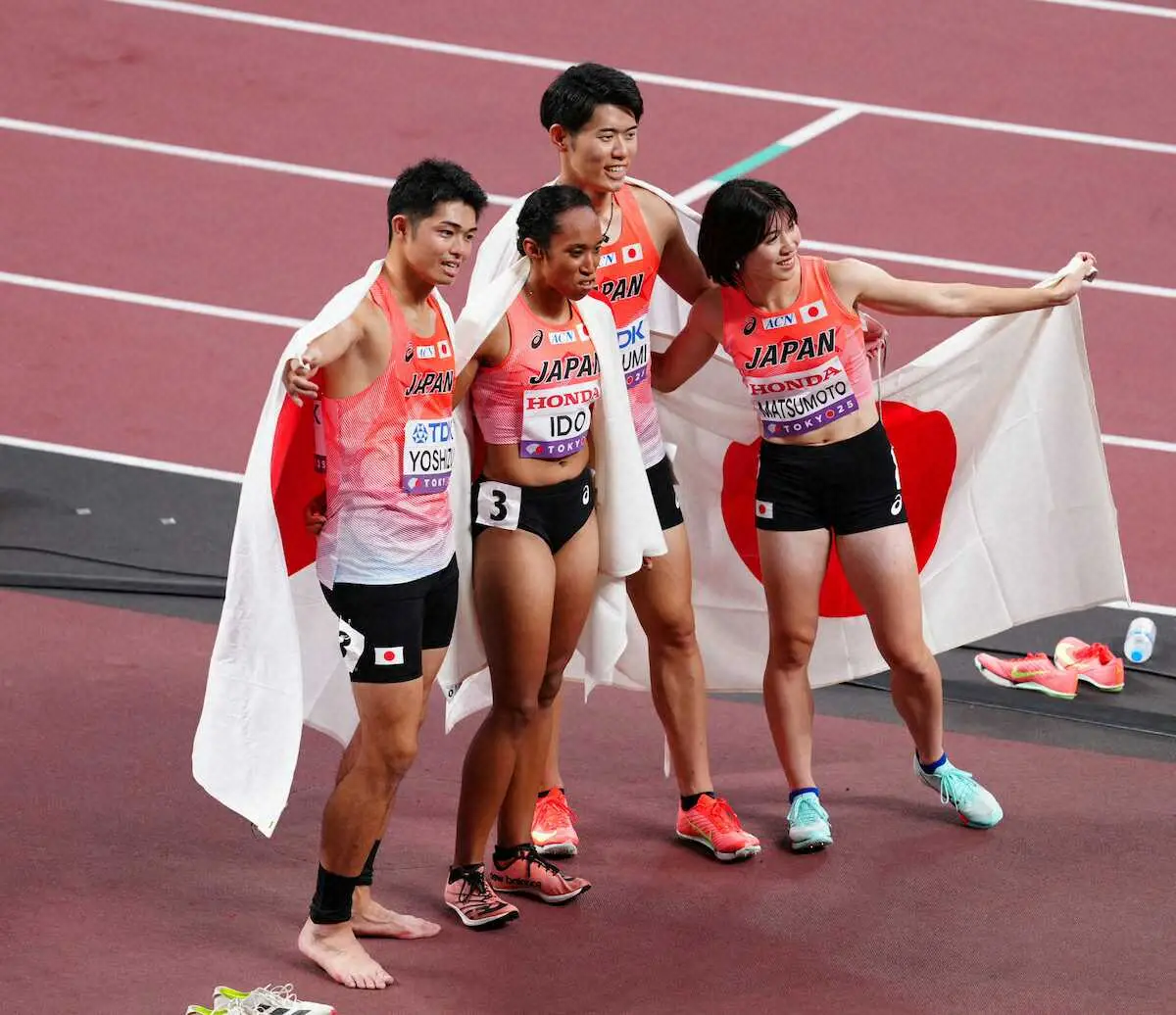 <世界陸上東京・初日>混合1600メートル決を8位で終えた吉津、井戸、今泉、松本(撮影・藤山 由理) Photo by スポニチ 【世界陸上】混合1600Mリレーは8位「世界との壁を痛感した」日本記録更新… ギャラリーで見る この記事のフォト 2025年09月13日の画像一覧 もっと見る 2025年09月13日の画像をもっと見る