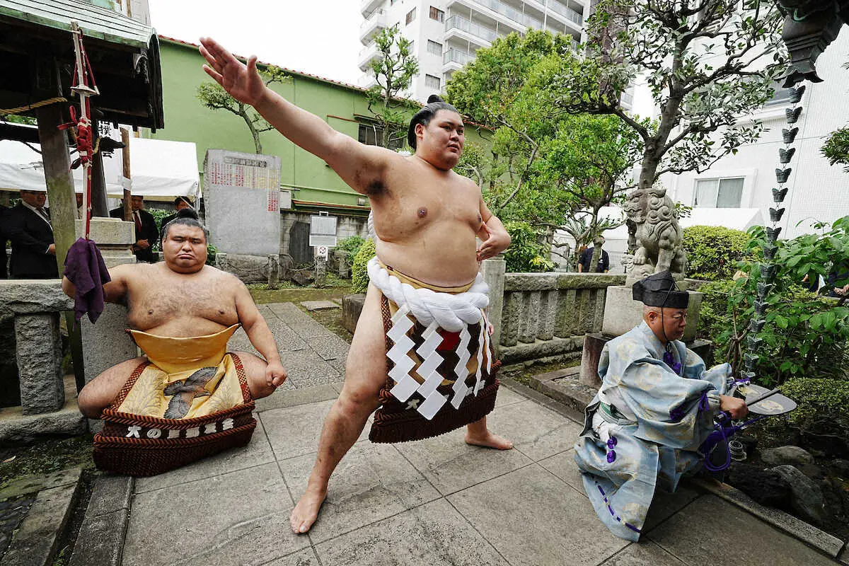 大の里は相撲の神様を祭る東京都墨田区の野見宿禰神社で土俵入りを行った。太刀持ちに高安、露払いに隆の勝を従え堂々の雲竜型を披露。横綱碑のしこ名を見て「いつかはという思いを持っていた。親方以来の日本人の名前が刻まれたことはうれしかった」と師匠の二所ノ関親方(元横綱・稀勢の里)に並べたことに感慨深げだった。初の東の正位で迎える秋場所に向け「横綱として初めての東京場所、東の横綱、しっかりやるべきことをやる。最初の5日間が大事だと思う」と気を引き締めた。