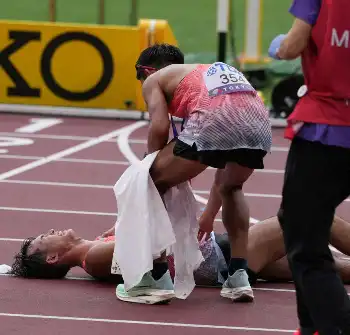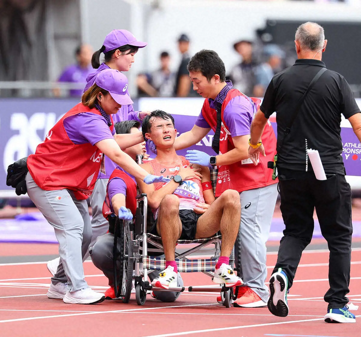 日本陸連の谷井孝行競歩担当ディレクターは「緊急搬送はされなかった。医務室に行ってアイスバスに入って、必要な処置して意識はっきりしている。熱中症、脱水症状があると思うが、初見では分からないところがある。最後は力がもう入らない状態でラストを歩いてたっていう状況だったので、そういった中で崩れ落ちてしまったんじゃないかと思う。アップですでに湿度80%。序盤から中盤ハイペースで進み、終盤気温上がったことでダメージあった。脱水で体に力が入らない、非常に難しい環境だった」とした。