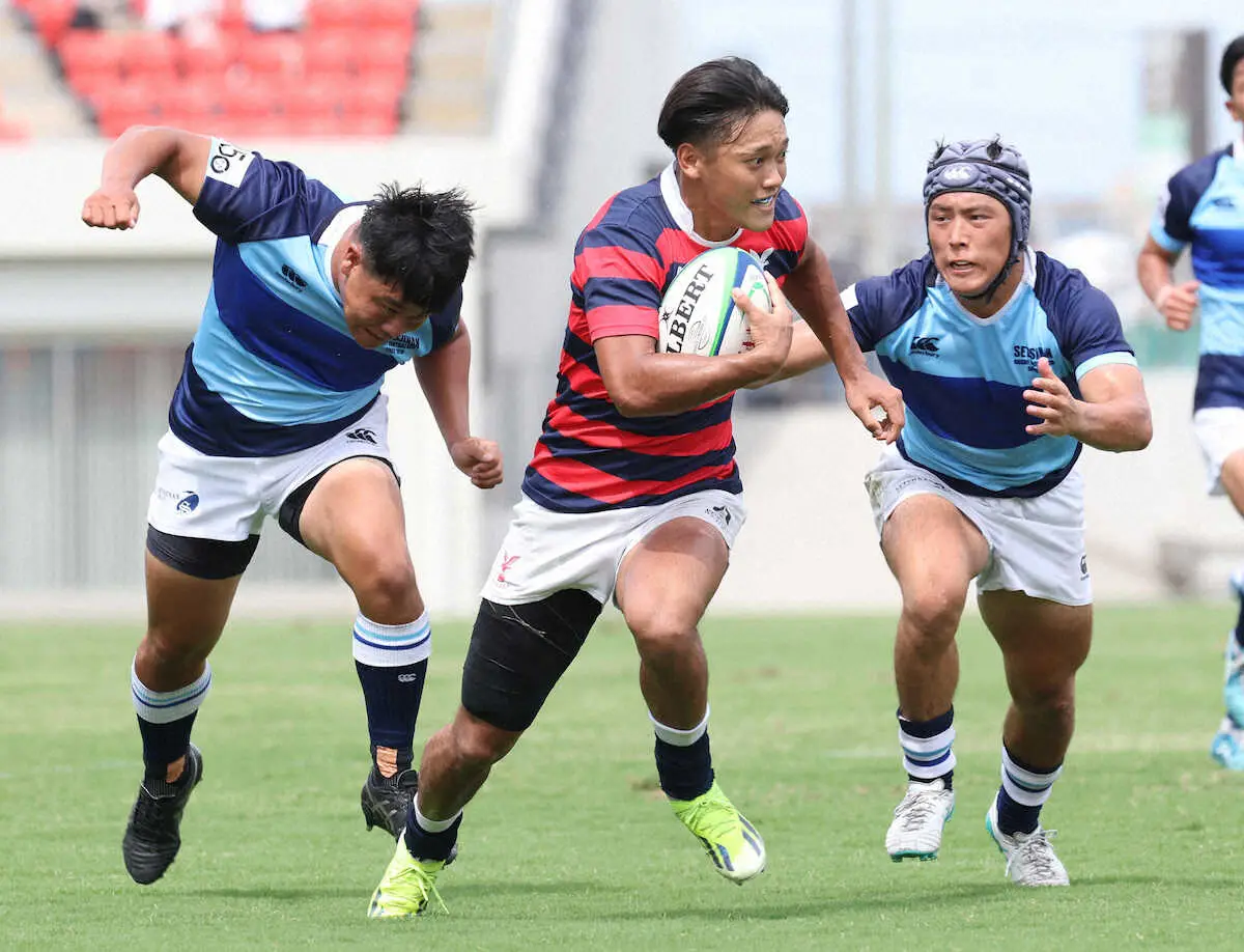 前半5分にWTB小林修市(4年)が右隅に先制トライを決めると、6分には小林修からのパスを受けたFB宮里快一(2年)が右を抜けてトライ。11分にはロックのシモネ・マヘ(2年)が左隅に飛び込んだ。23分はCTB奈須貴大(4年)が追いすがる摂南大守備陣を2回振り切って中央にトライ。奈須は33分にも中央を抜けてフォローしていたフランカー平野龍(4年)のトライにつなげた。前半で5トライすると後半7分にも相手ミスのボールを拾った奈須が2トライ目。攻撃の手を緩めることなく4トライを重ねた。