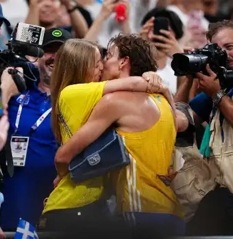 【世界陸上】世界新記録達成のデュプランティスが婚約者と熱いキス 歓喜の後…婚約者の観客席へ