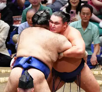 大の里「良かった」「目の前の一番に集中して頑張ります」 阿炎を豪快に押し倒して3連勝