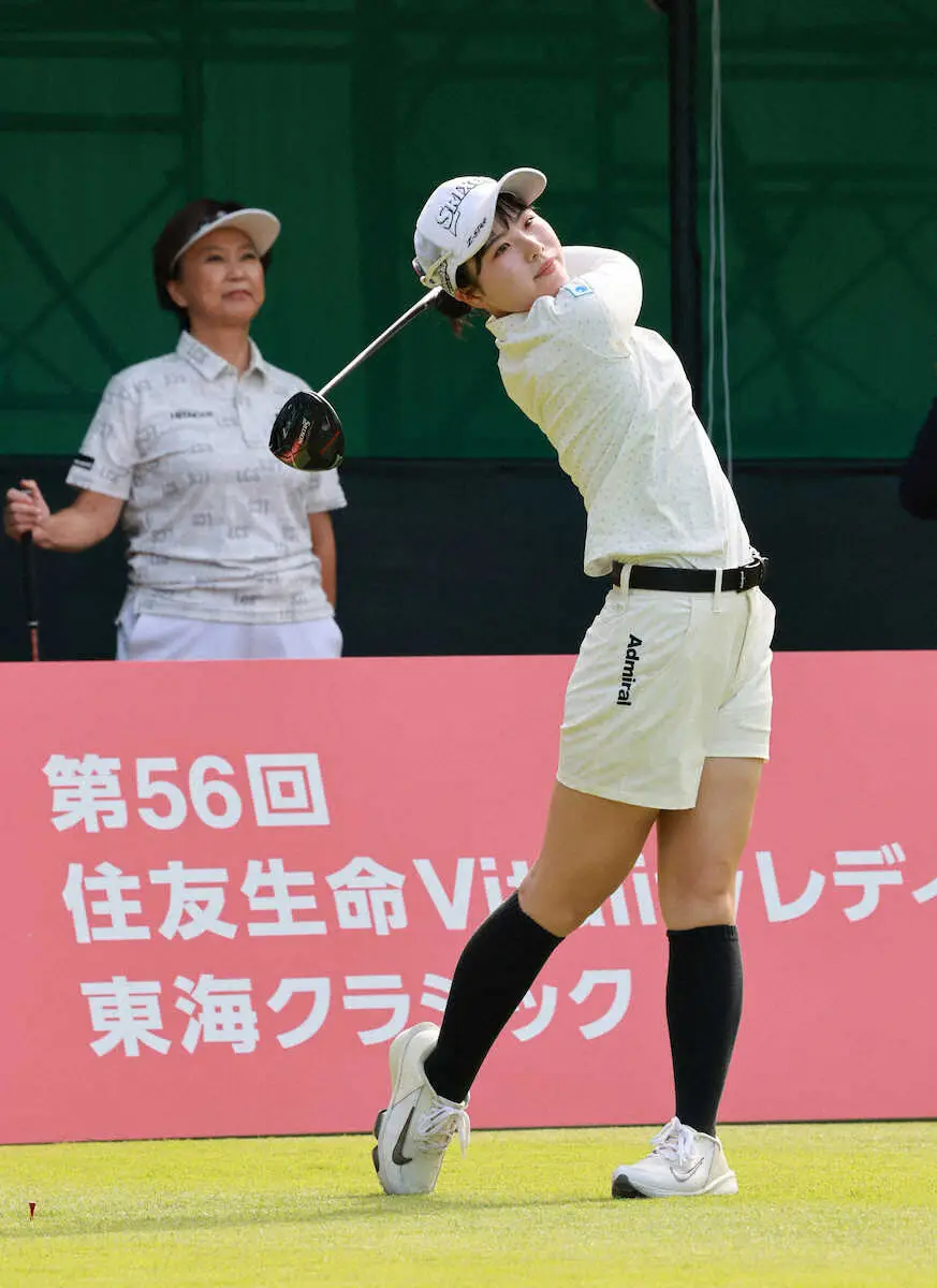 <住友生命レディス東海C・プロアマ>小林会長の見つめる中ティーショットを放つ尾関彩美悠(撮影・井垣 忠夫)