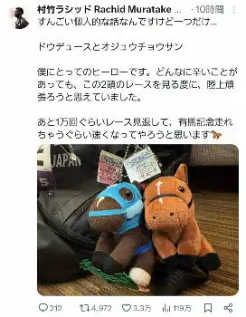 さらに続くポストでは「すんごい個人的な話なんですけど一つだけ…」と続け、「ドウデュースとオジュウチョウサン」と名馬のぬいぐるみキーホルダーの写真を投稿。