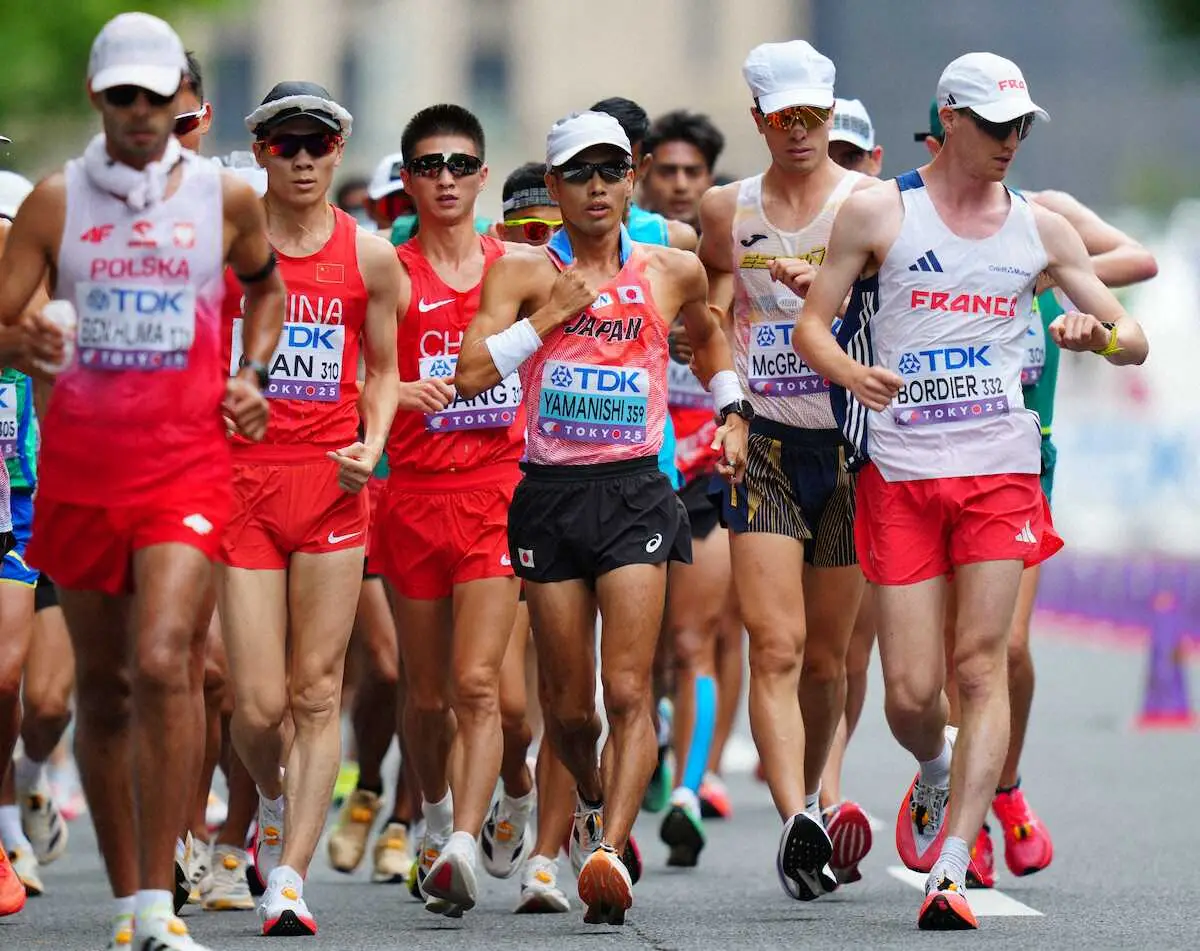 山西は19年ドーハ大会と22年オレゴン大会で2連覇。今年2月の日本選手権20キロ競歩で1時間16分10秒の世界新記録をマークしており、ランキング1位の本命として3度目の頂点を狙う。大会初日の35キロは26位だった丸尾の1時間17分24秒はランク2位、吉川の1時間17分38秒は5位にあたり、表彰台独占も十分に狙える。22年オレゴン大会では山西が金、池田向希(27=旭化成)が銀だったが、メダル独占はならなかった。