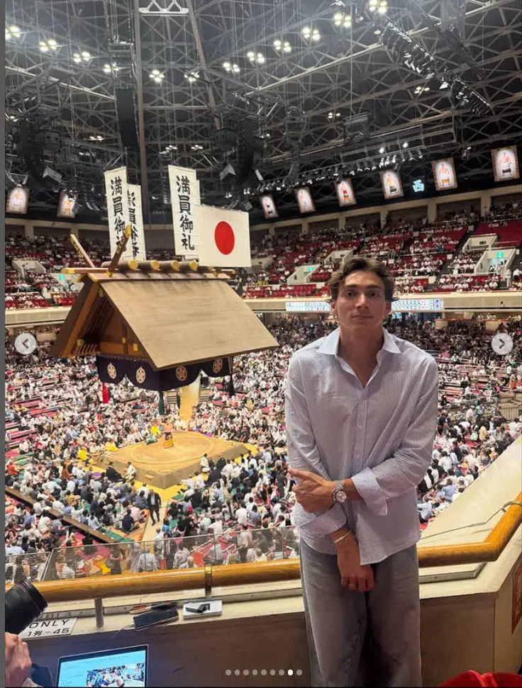 デュプランティスは「Arigato Tokyo」とつづり、うどんなどの日本食を楽しむ様子や、大相撲を観戦する様子などを投稿した。