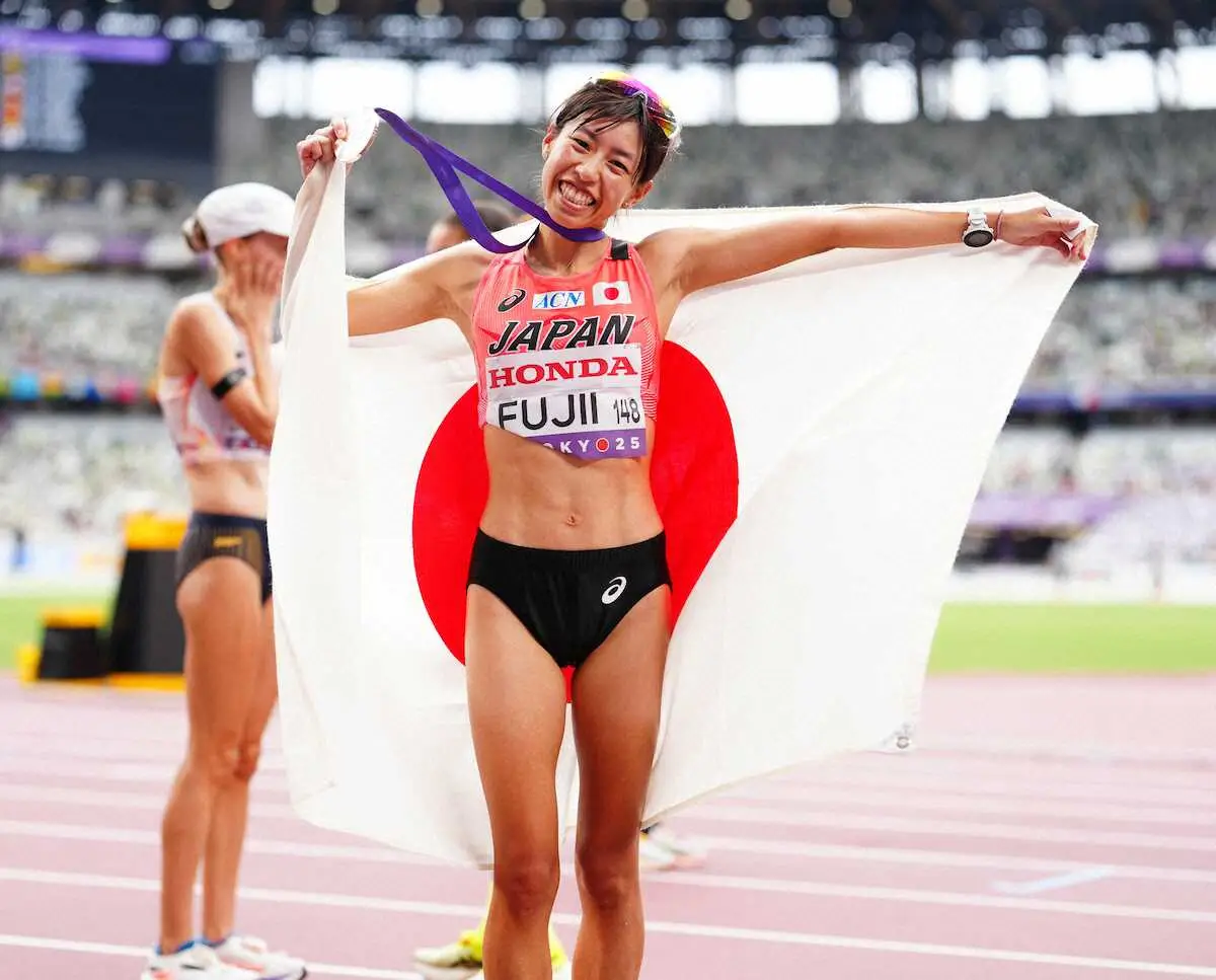 女子20キロ競歩で、4大会連続出場の藤井菜々子(26=エディオン)が自身の記録を15秒更新する1時間26分18秒の日本新記録で銅メダルを獲得した。競歩の女子日本勢では、五輪、世界選手権を通じ初の表彰台となった。今大会の日本勢のメダルは、男子35キロ競歩3位の勝木隼人(34=自衛隊)に続き2個目。歴史的なメダルを先月22日に急逝したエディオン元監督の恩師、川越学さんにささげた。