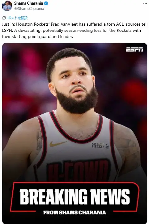 NBAロケッツのポイントガード(PG)、フレッド・バンブリート(31)が膝の前十字じん帯断裂の重傷を負い、来月21日に開幕する25~26年シーズンを全休する可能性があると、米スポーツ専門局ESPNのシャムス・シャラニア記者が22日、自身のXで報じた。