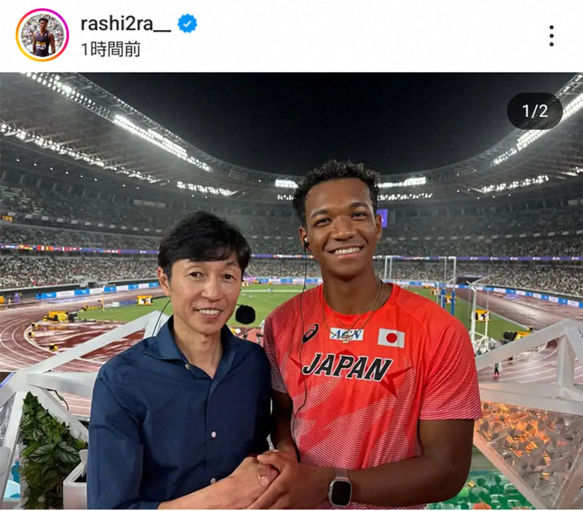 世界陸上男子110メートル障害で5位入賞した村竹ラシッド(23=JAL)が24日、自身のSNSを更新し、「陸上人生における原動力の一つとなっている」憧れの人との2ショットを投稿した。