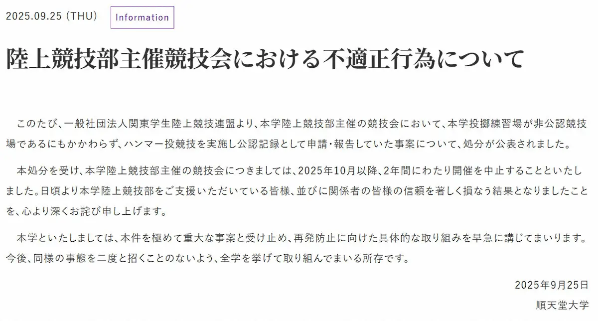 関東学連は、「順天堂大学の自主申告により、同大学陸上競技部主催の競技会において、以下の不適正行為があったことが判明しました」と報告。「1989年から1992年までの間は少なくとも一部の競技会において、1993年から2024年8月9日までの間は継続して、本件競技会の実施種目のうち『ハンマー投』は、投てき練習場で競技会を実施したうえで、その記録をさくらキャンパス競技場で実施された公認記録として申請および報告していた。また、1989年に実施された第2回五大学対校陸上競技選手権大会の少なくとも予選において、および、少なくとも1992年に実施された1回の関東学生競技会において、上記と同様の行為がなされたことが確認された」と非公認の施設での記録を公認施設での記録として申請、報告していたことを公表した。