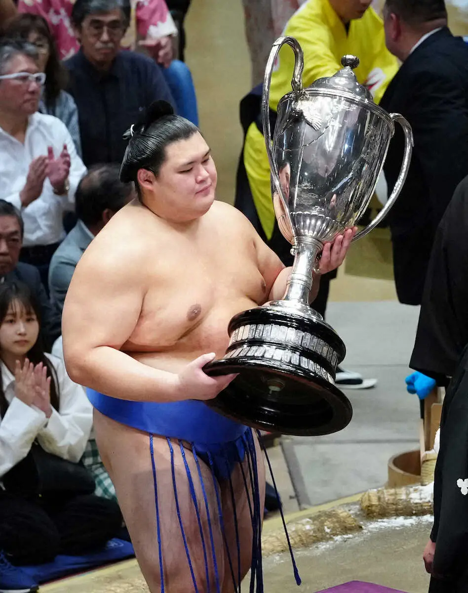 不戦勝だった14日目を終えて師匠の二所ノ関親方(元横綱・稀勢の里)から「淡々といきなさい」と助言を受けたと明かし、「本割は淡々とじゃなかったですけど、優勝決定戦は淡々とやることを意識してしっかり勝ち切ることができました」と笑みを浮かべた。