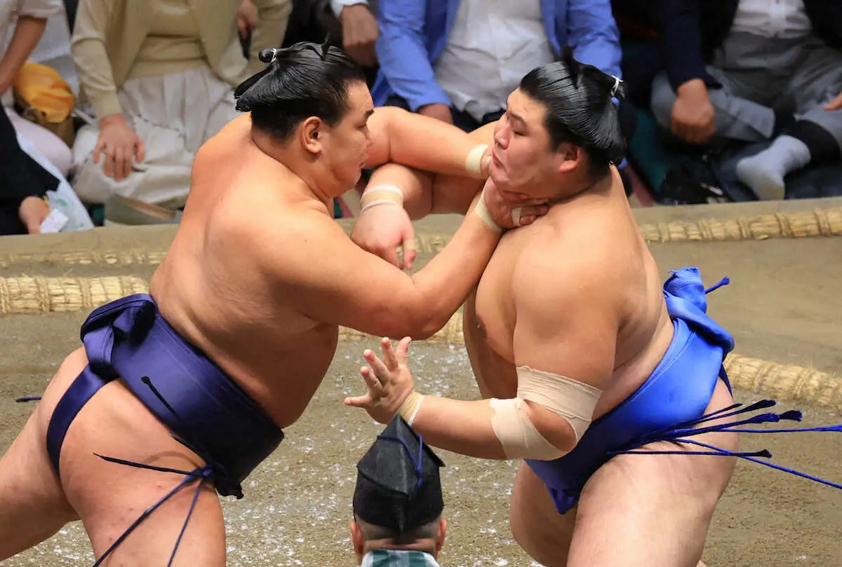 大歓声から静寂へ。結びの一番。立ち合いで大の里を圧倒すると、勝負あり。一瞬の決着に国技館は騒然となった。13勝2敗。再び首位タイに躍り出た。
