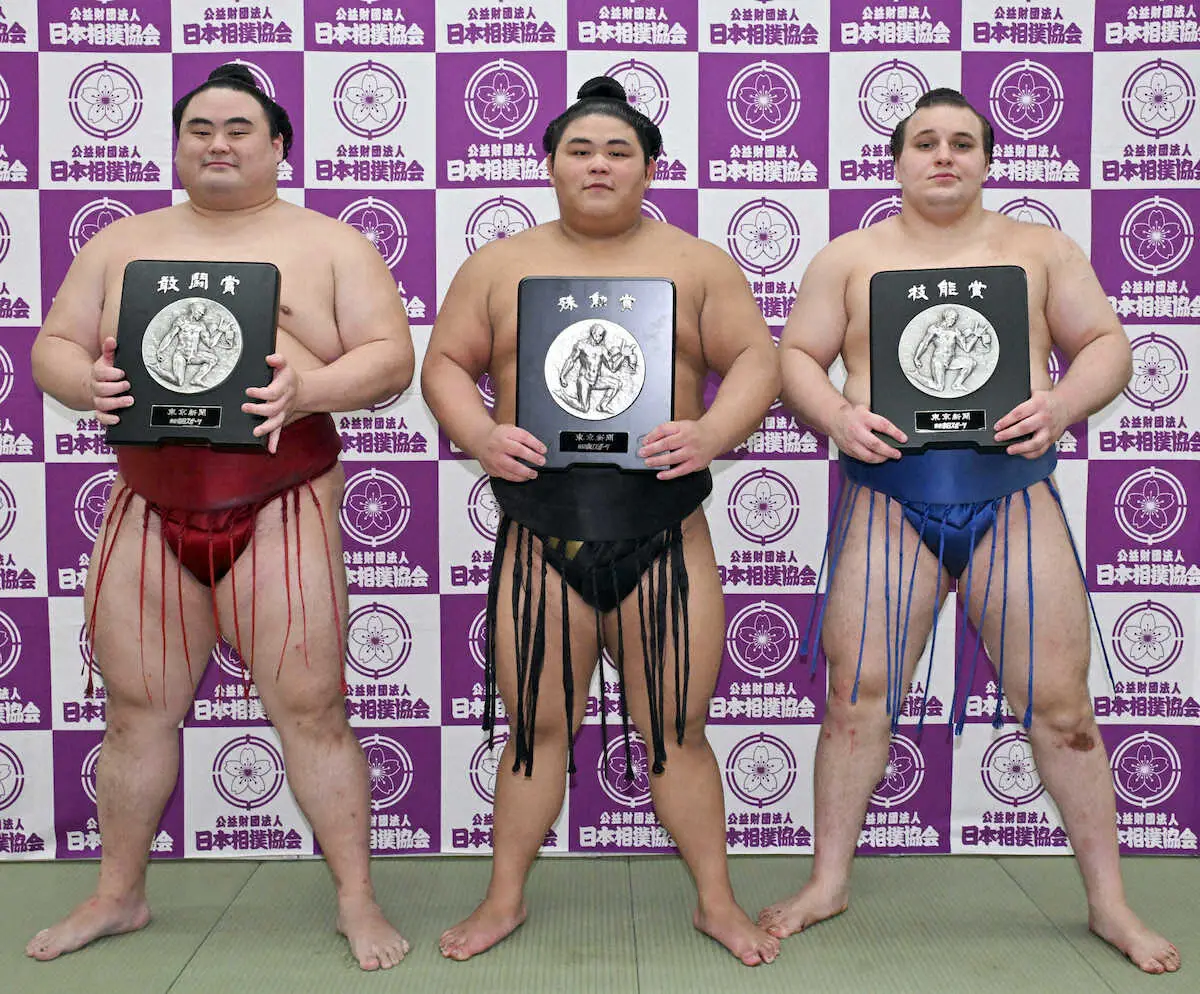 三賞の受賞力士。(左から)敢闘賞の隆の勝、殊勲賞の伯桜鵬、技能賞の安青錦(代表撮影)