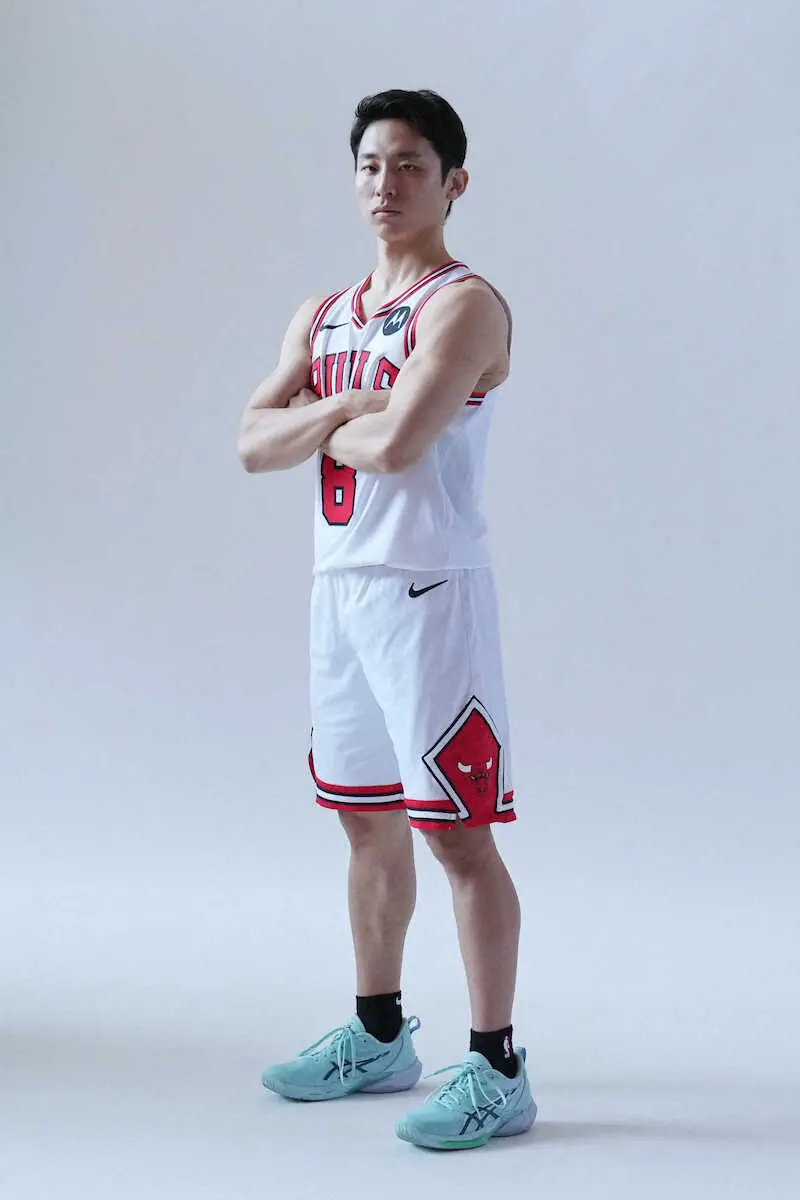 メディア撮影に応じるブルズ河村勇輝(AP)