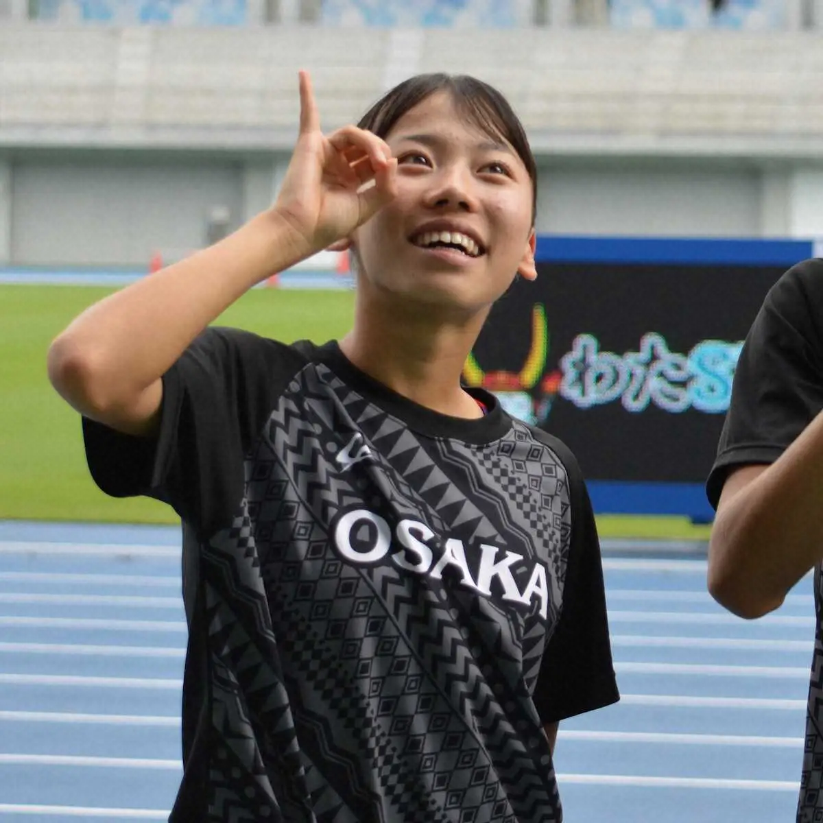 本職の800メートルで2連覇を達成し、志願して出場したリレー。表彰式では大阪にちなみたこ焼きポーズを披露。「高校最後の800メートルで大阪を背負わせてもらって凄く楽しかった」。今後は駅伝などで走る予定だ。