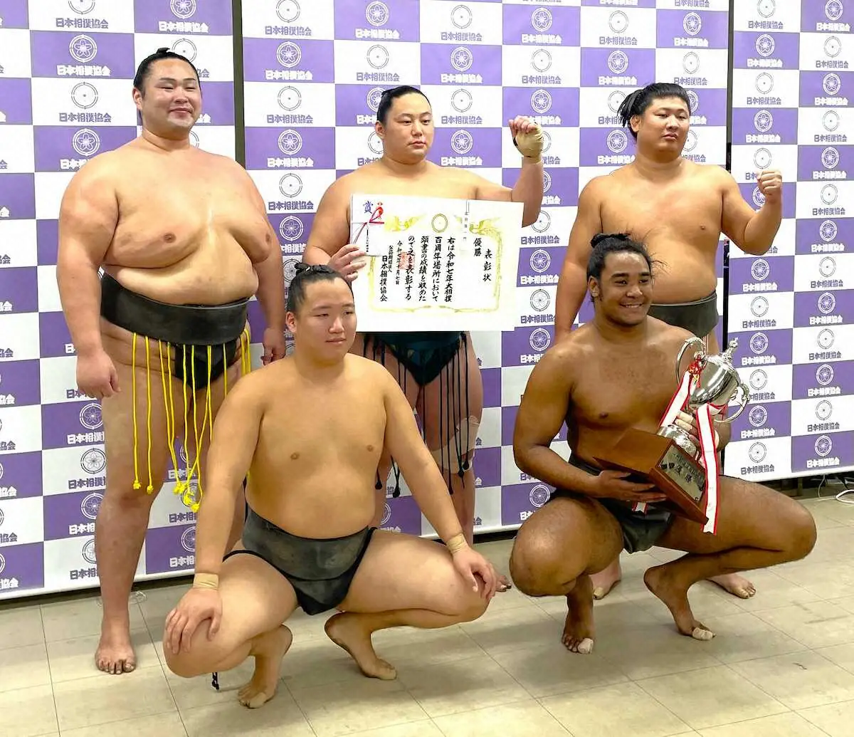 <大相撲百周年場所>一門別選抜団体トーナメントで優勝した出羽海一門A(前列左から)清の山、雷道(後列左から)栃武蔵、三田、東俊隆