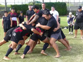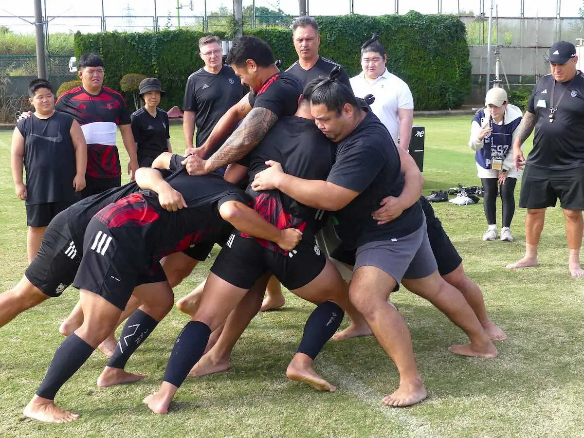 中村親方(元関脇・嘉風)がチームスタッフと親交があった縁から実現。モール練習では、100キロ超のFW5人で力士3人を力いっぱい押したがほとんど動かなかった。
