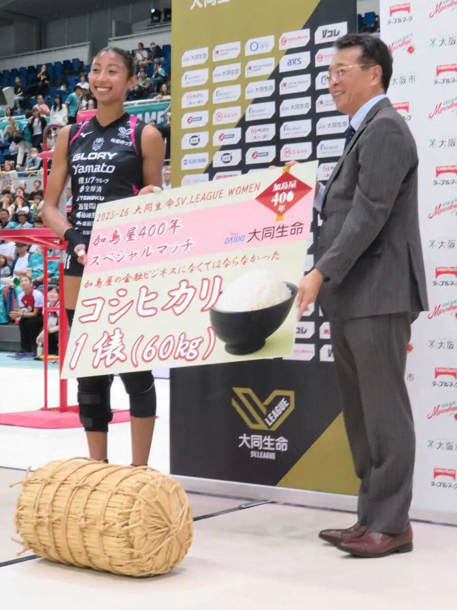 ヴィクトリーナ姫路が10日の開幕戦に続いて昨季女王の大阪マーヴェラスに連勝した。今季初先発の宮部藍梨(27)がアタックで28点、ブロックを3回決める活躍で31得点。フルセットで大阪Mを振り切った。プレーヤー・オブ・ザ・マッチに輝き、コシヒカリの俵(60キロ)を手にして笑顔で受け取った。